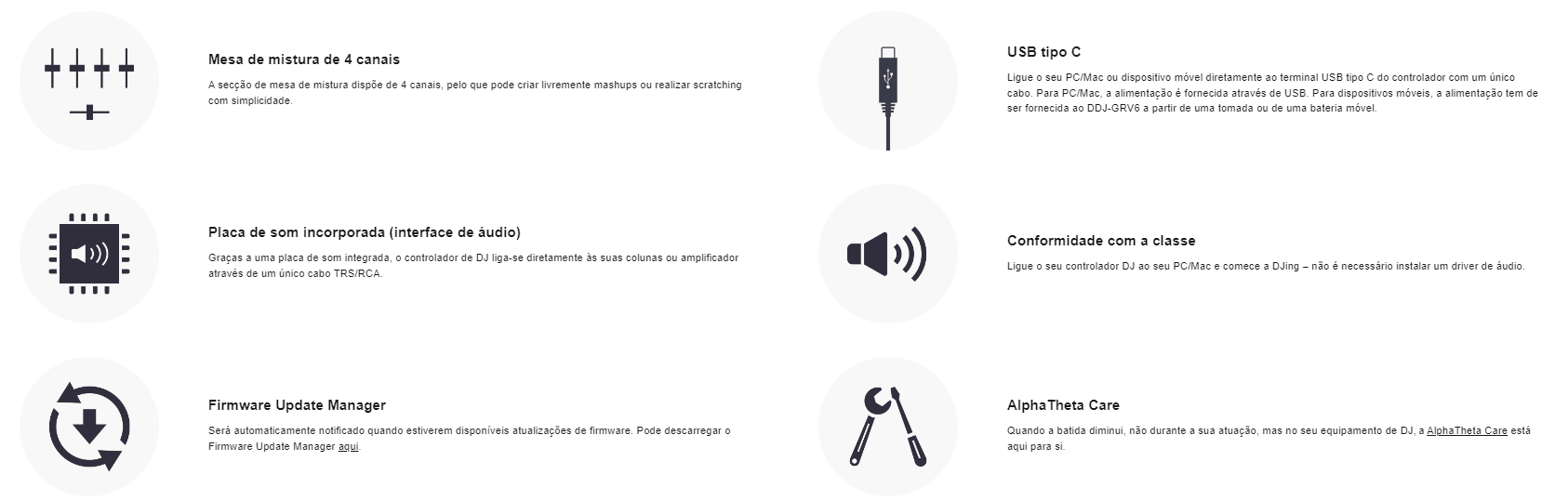 O controlador de DJ AlphaTheta DDJ-GRV6 foi projetado para DJs que procuram uma experiência de atuação profissional com total versatilidade. Com 4 canais, este controlador oferece funcionalidades avançadas e conectividade de última geração, permitindo transições suaves e criativas, seja em clubes, estúdios ou festas. Perfeito para DJs que procuram elevar o seu nível, o DDJ-GRV6 destaca-se pela sua qualidade de construção, facilidade de uso e um conjunto de recursos indispensáveis para criar sets envolventes e únicos.