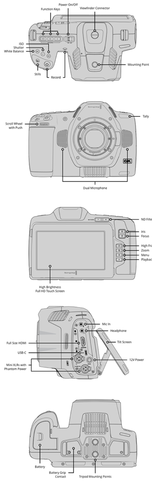 O design da Pocket Cinema Camera 6K combina robustez e praticidade: construída em composto leve de fibra de carbono e policarbonato, oferece resistência, durabilidade e conforto na gravação. O ecrã tátil HDR de 5 polegadas com 1500 nits de brilho proporciona uma visualização clara em qualquer ambiente, enquanto os filtros ND integrados e a bateria de maior capacidade asseguram mais autonomia e controlo sobre a luz em filmagens exigentes.