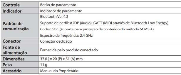 - Dimensões Adaptador Bluetooth BOSS BT-DUAL: 37 (L) x 20 (P) x 31 (A) mm