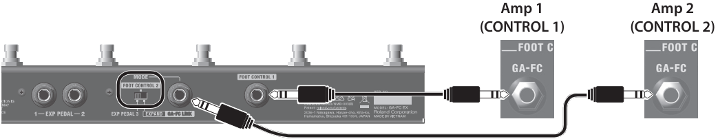 Permite ligar o GA-FC EX a ambos os amplificadores (via dois cabos) para selecionar memórias e efeitos em ambos, em simultâneo ou de forma independente.
