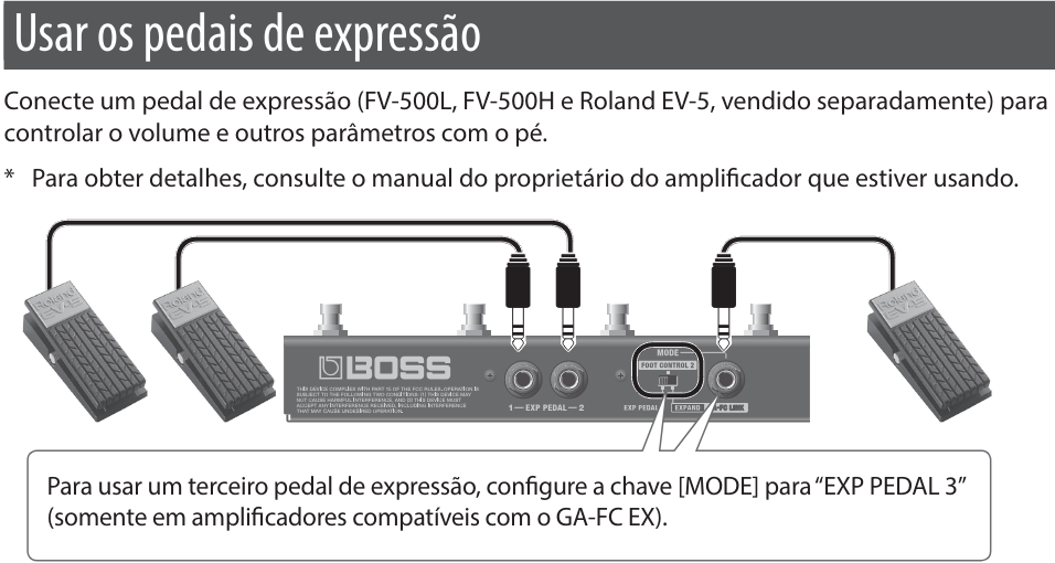 - (*) Pedais de Expressão - BOSS EV-5, BOSS EV-30, BOSS FV-500L e BOSS FV-500H (vendidos separadamente)