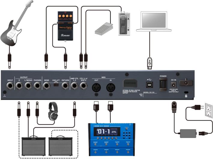 Além da utilização em palco, a BOSS GX-100 destaca-se como um interface áudio USB para gravação e performance com um computador. Podes gravar diretamente para um software de produção musical, executar o re-amp de pistas e monitorizar o som geral através das saídas da BOSS GX-100. A entrada para auscultadores permite-te praticar em qualquer momento e local, enquanto o looper interno é perfeito para sessões livres, desenvolver sons e ideias e aumentar o alcance criativo durante as performances.
