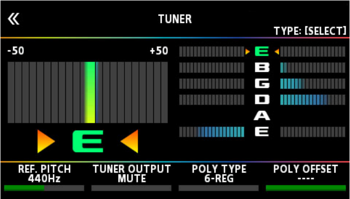 BOSS GX-100 está equipada com um afinador monofónico que permite afinar uma corda de cada vez, e um afinador polifónico que permite tocar e afinar todas as suas cordas abertas simultaneamente.