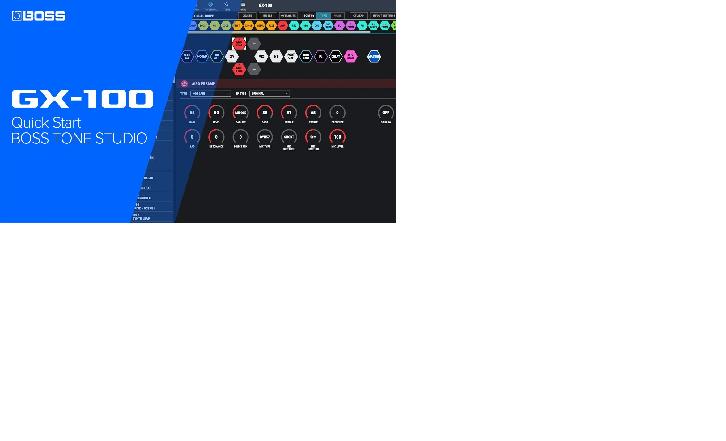Um dos principais focos da AIRD é a relação reactiva amplificador/altifalante, que é essencial para a sensação dinâmica e a capacidade de resposta musical dos amplificadores a válvulas. Esta relação vital é totalmente trazida à vida com os amplificadores da BOSS GX-100, produzindo sons de guitarra que estão vivos com potência, presença e profundidade. Graças à AIRD, o seu som sente-se sempre bem sob os seus dedos e “assenta na mistura” corretamente, proporcionando uma experiência musical verdadeiramente orgânica que nunca esteve disponível num processador de guitarra digital até agora.