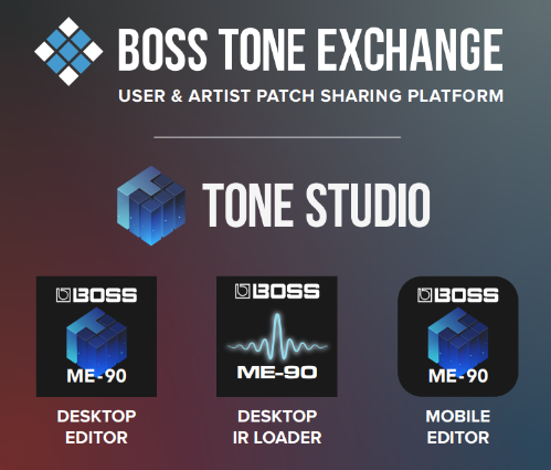 BOSS Tone Studio: O software dedicado oferece uma interface gráfica para editar patches, carregar IRs, organizar memórias e aceder a bibliotecas de timbres no BOSS Tone Exchange.