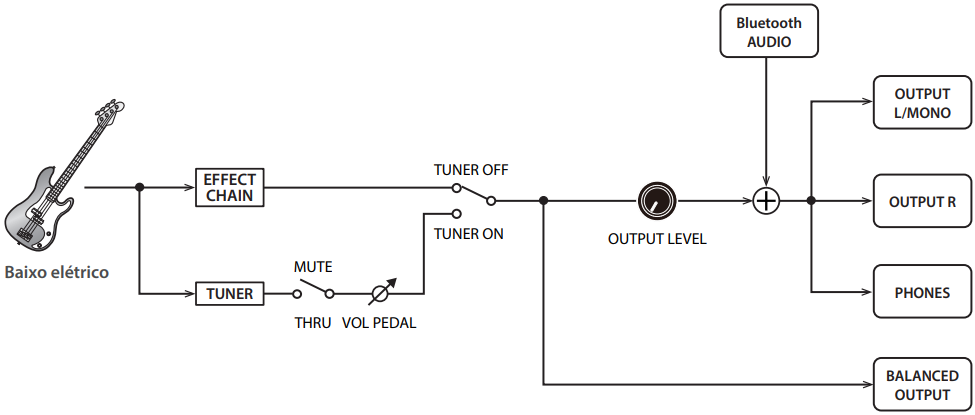 Seletor AMP/LINE: Um switch na saída de 1/4 de polegada permite otimizar o som para ligar a um amplificador de baixo tradicional (AMP) ou a um sistema de som full-range (LINE/PA/Interface).