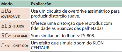 | 5 | Blues | Emula o modo principal "BLUES" (Overdrive Expressivo com Ampla Gama Tonal). |
