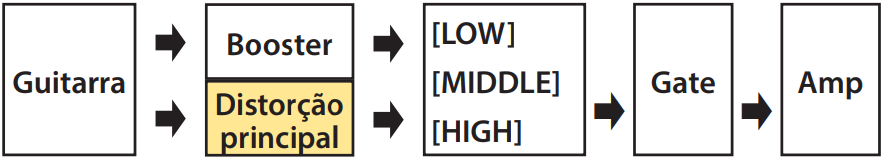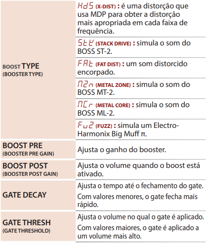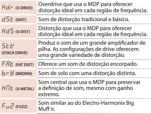 | FAT DIST (FAt) | Distorção | Distorção cheia e encorpada, estilo Mega Distortion (BOSS MD-2). |