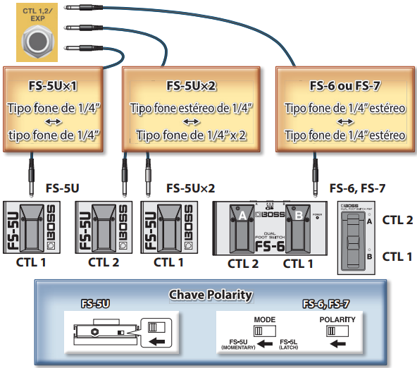 | Chave Boost (Status) | Liga/desliga o Booster interno. | CC# (Booster On/Off) | 4. Canal MIDI: O pedal tem a opção de selecionar o Canal MIDI de recepção. Por padrão, geralmente é o Canal 1. |