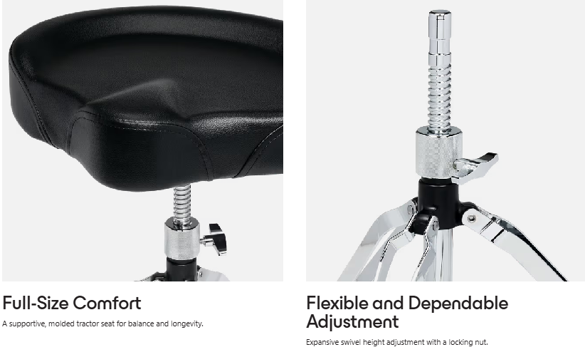 The DW 5000 Series Tractor Seat Throne was designed with a full-size, molded, tractor-style seat top for ergonomic comfort, and all the strength of a cast, under-seat, vise mount. The corkscrew height adjustment allows you to easily find your optimal seat height. The heavy-duty steel tripod base and double-braced legs are designed for maximum durability, making the Tractor Seat Throne an easy choice for drummers the world over. DW: The Drummer's Choice. *