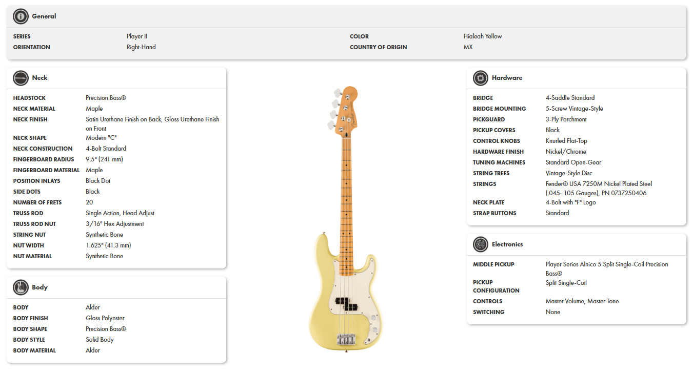 Equipado com captadores Player Series Alnico V Split-Coil P bass, o Player II Precision Bass oferece agudos doces, médios musicais e graves poderosos que se destacam em qualquer gênero musical. O design do hardware, incluindo uma ponte ajustável de 4 saddles, saddles de aço de ranhura única e afinadores abertos, garante estabilidade de afinação precisa, permitindo uma exploração sonora sem limites.