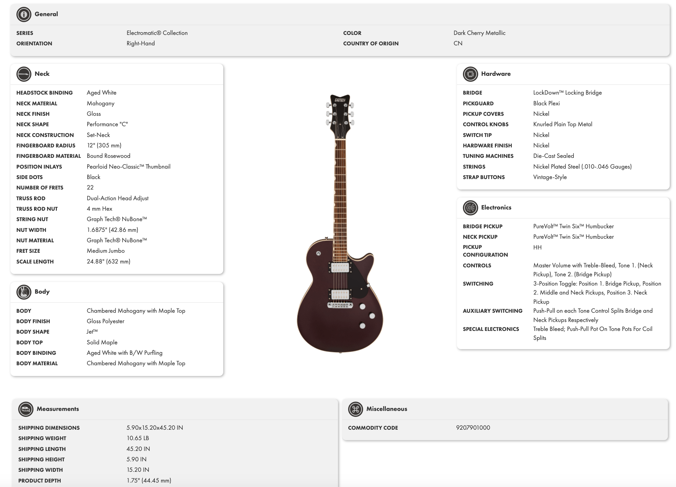 Visualmente, a Electromatic Jet é um espetáculo. O acabamento Dark Cherry Metallic brilha ao vivo, o pickguard preto plexi completa o look elegante e o headstock Split-V dá aquela presença clássica que só uma Gretsch oferece.