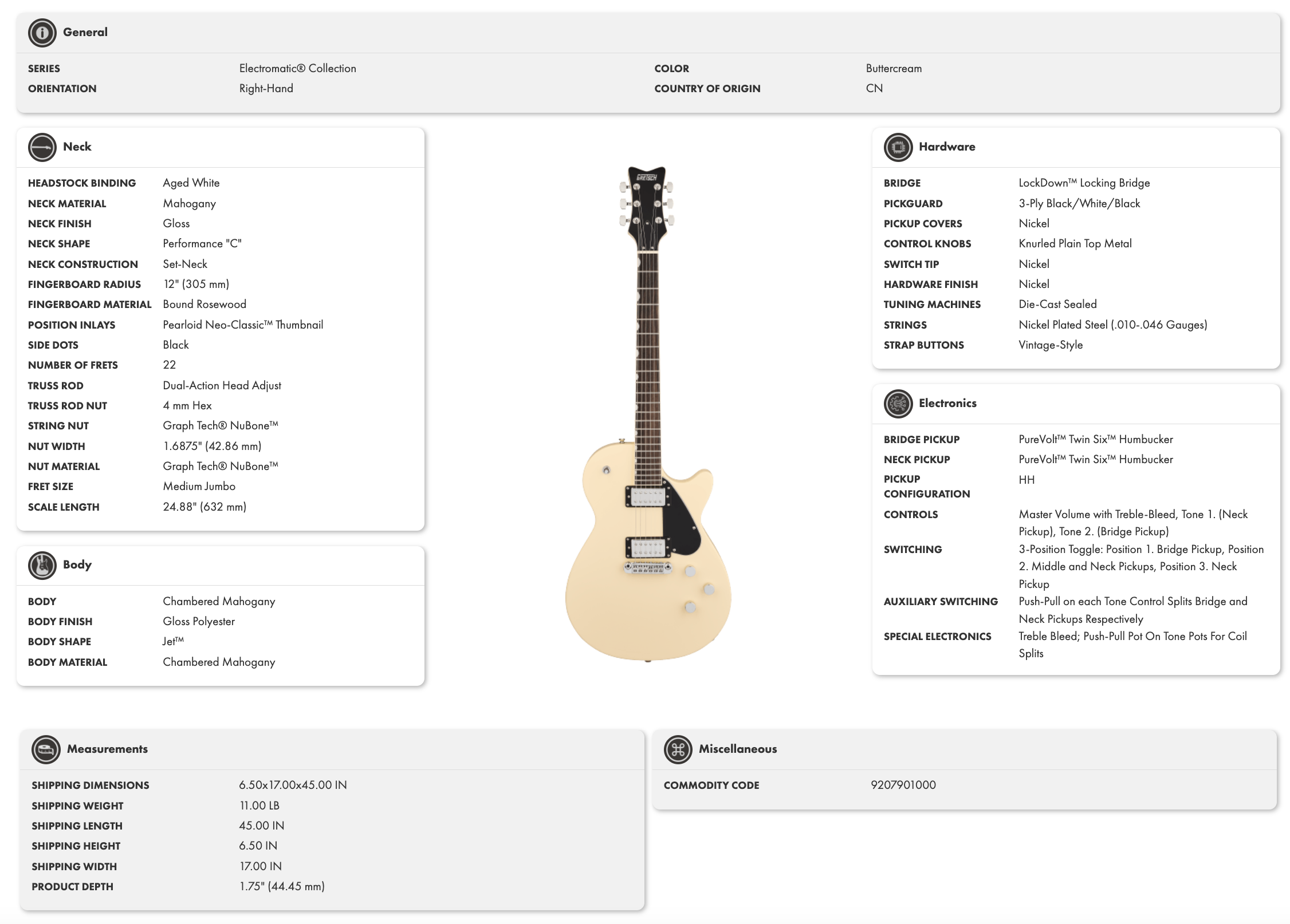 O LockDown locking bridge não só mantém a afinação estável, como maximiza a transferência de vibrações. Os afinadores die-cast e os knobs Gretsch Knurled Radio completam o pacote. A cor Buttercream dá-lhe um toque distinto que sobressai em palco ou em estúdio.