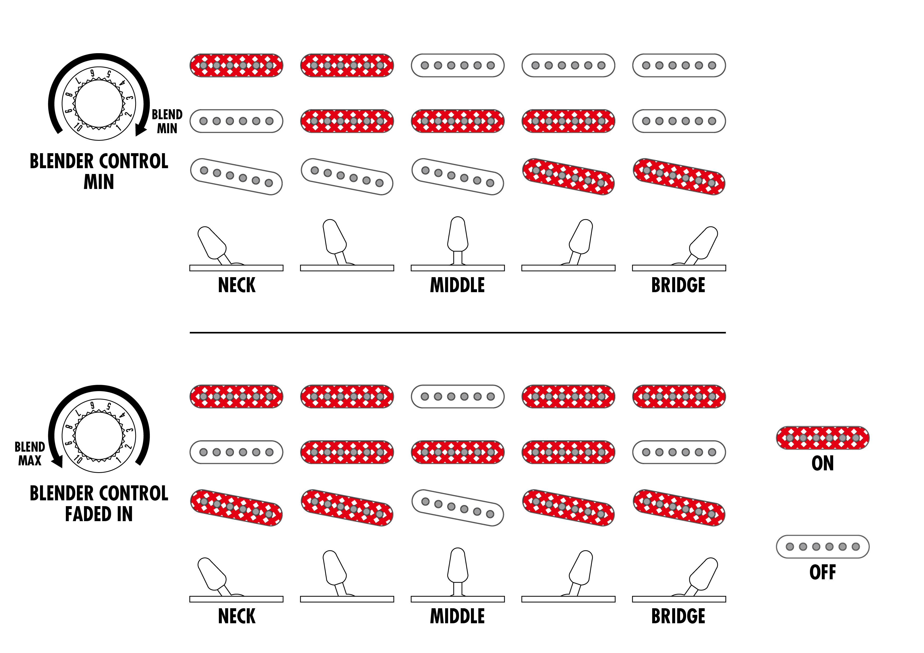 Sistema Blender: Mistura progressiva de captadores para versatilidade tonal extrema.