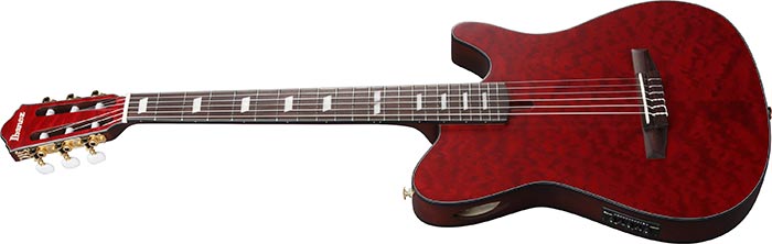 A Ibanez FRH20QMN-WRL Wine Red Low Gloss é uma guitarra híbrida excecional que combina a elegância de uma guitarra clássica com a tocabilidade moderna de um modelo elétrico. Com corpo fino em Quilted Maple e Sapele, braço em Nyatoh, escala em Rosewood e eletrónica Ibanez AEQ210T com afinador incorporado, oferece uma sonoridade quente, equilibrada e natural. Ideal para guitarristas que procuram conforto, estética refinada e o som autêntico das cordas de nylon com versatilidade para palco e estúdio.