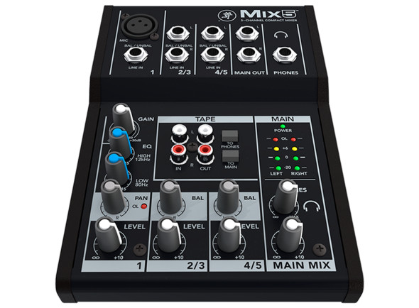 O estéreo de dois 1/4" entradas de linha cada apresentam um equalizador de 3 bandas, controle de equilíbrio, controle de nível tem um indicador de sobrecarga LED. Com acabamento e design robusto, confiável, construído para durar, a Mackie MIX-5 possui entrada de microfone / linha está equipado com XLR e 1/4 "conectores, um equalizador, pan, controle de nível e um indicador de sobrecarga LED. Compacta e portátil essa mesa é indicado para pequenos estudios, voz e violão, entre outras funcionabilidade.