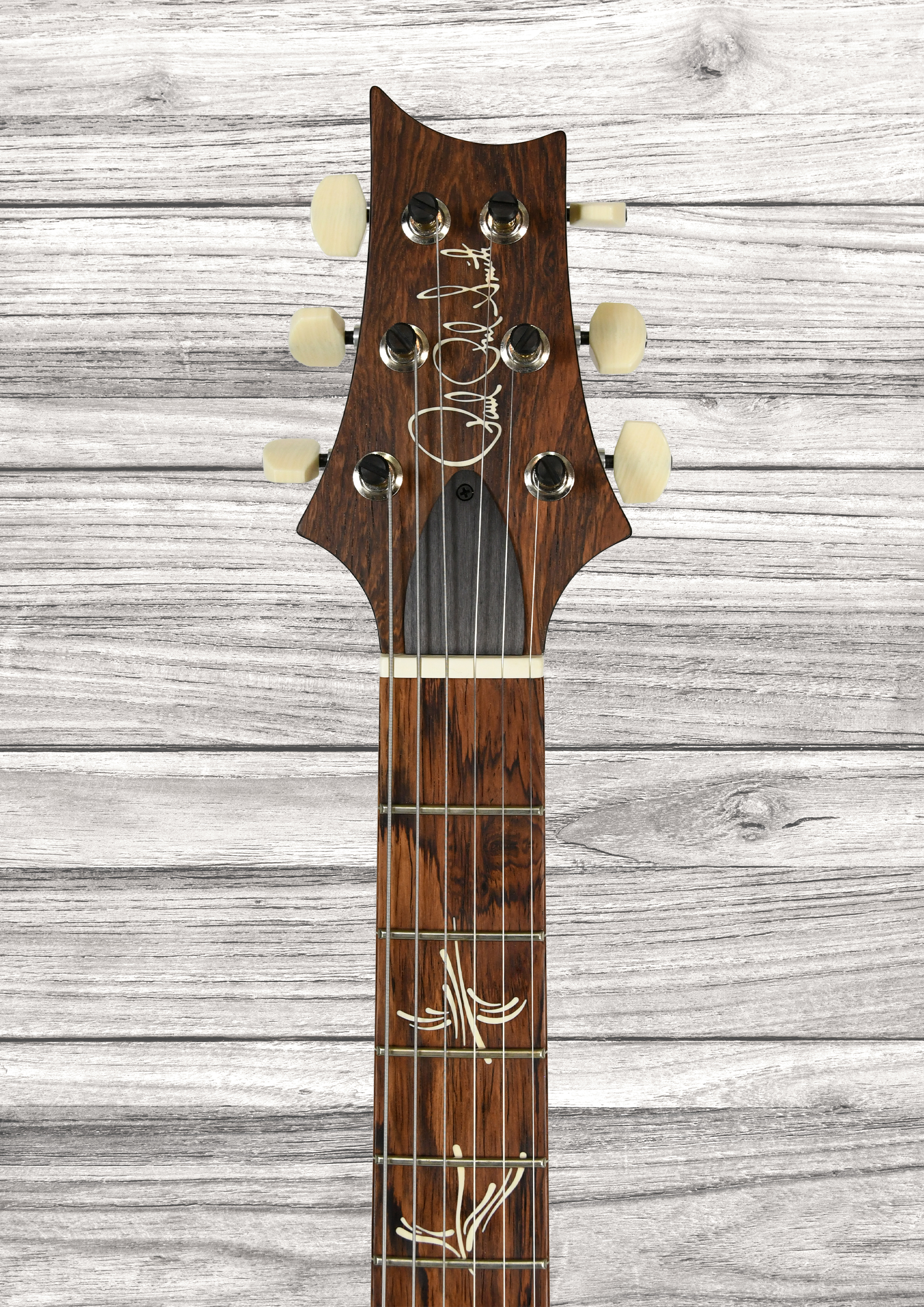 O braço em mogno com perfil Pattern foi desenhado para um equilíbrio perfeito entre robustez e conforto — grosso o suficiente para ressonância, mas natural na mão para longas horas de performance. A escala em rosewood hondurenho confere suavidade ao toque, com os clássicos inlays de pássaros PRS a marcar presença.