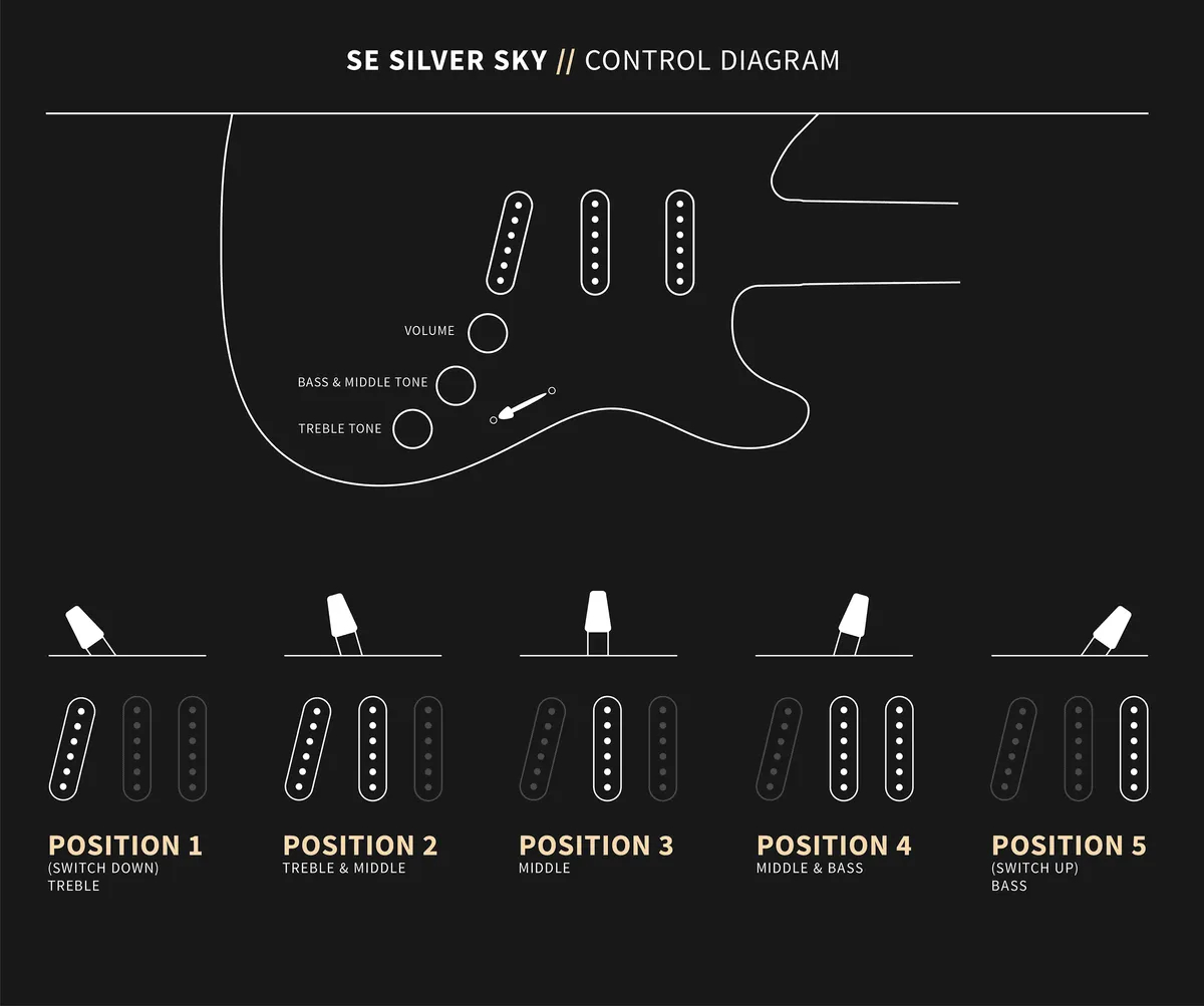O design inteligente continua na cabeça invertida Silver Sky, uma assinatura visual inconfundível, e no tensor de dupla ação PRS, que permite ajustes rápidos e precisos sem desmontagens. Cada detalhe foi pensado para oferecer ao músico uma experiência completa — tanto estética como sonora.