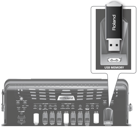 A porta USB para pen de memória é a sua passagem para um dos recursos mais úteis do Roland FR-4X Acordeão de Teclas. Inserindo uma pen USB com as suas músicas favoritas ou músicas recentemente gravadas pela sua banda, pode tocar por cima enquanto a música é reproduzida e assim aprimorar a sua performance.
