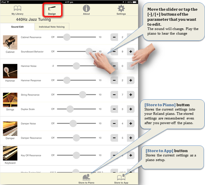 - Parâmetros relacionados à posição da tampa do piano, cordas e martelos estão listados de maneira prática, e podem ser facilmente editados e transferidos para o piano.