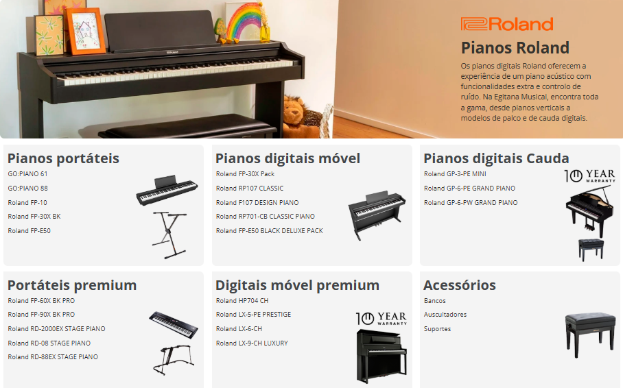 A Roland Corporation of Japan fundada em 1972 em Osaka é uma marca líder mundial no design, produção e distribuição de instrumentos musicais electrónicos, incluindo pianos digitais portáteis e verticais, sintetizadores e workstations, caixas de ritmos para música electrónica, equipamentos diversos para guitarristas, baterias electrónicas V-Drums, acordeões electrónicos, sintentizadores em software, mesas de mistura e switchers de vídeo profissionais. Um mundo de soluções baseadas na inovação, tecnologia de vanguarda, qualidade e fiabilidade. A Egitana tem o prazer de trabalhar com a Roland em Portugal há 35 Anos.