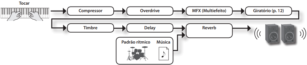 | Compressor | Knob (Fácil acesso) | Efeito de compressor de fácil ativação para garantir que os sons (especialmente o piano) se destaquem em mixagens altas de banda. |