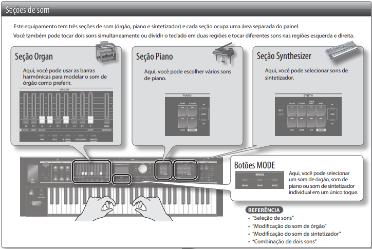 | Sons | Botões de Seção Dedicada | Acesso instantâneo aos principais grupos de sons: Organ, Piano e Synth. |