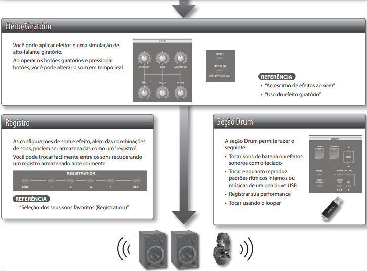 - Melhore suas performances e estudos usando padrões de ritmo, metronomo, looper, gravação e reprodução de áudio via USB e outros recursos internos