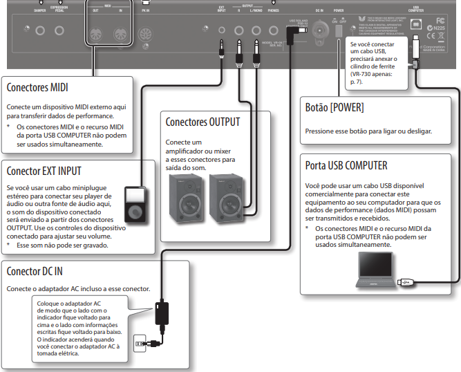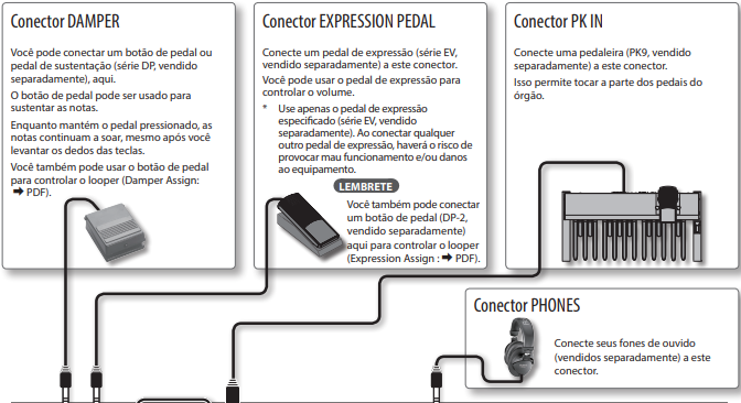 | Conexões | Padrão (Saída L/R, Auscultadores, MIDI, Pedal). | Entradas de áudio, USB-to-Host/Device. |