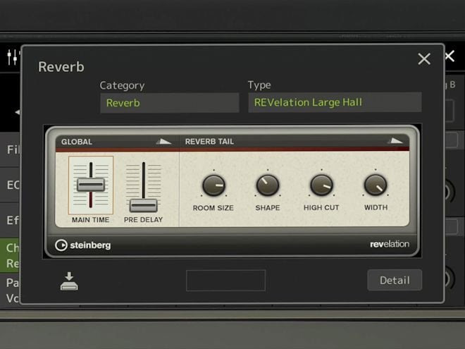 O reverb é muitas vezes negligenciado, mas experimentamo-lo ao nosso redor todos os dias. Nos Workstations Arranjadores, o reverb é usado nos Sons, Estilos, Músicas MIDI, Multi-Pads e na Entrada de Microfone, razão pela qual a introdução do Reverb REVelation da Steinberg tem um grande impacto no som do Genos2. O REVelation caracteriza-se pela resolução extremamente alta.